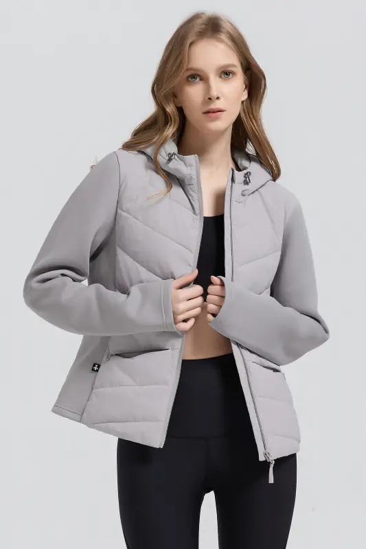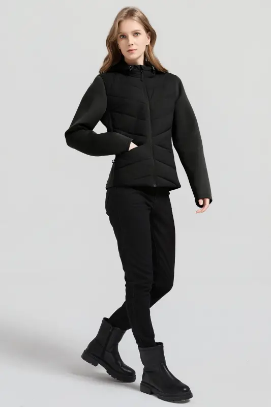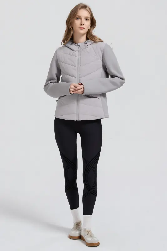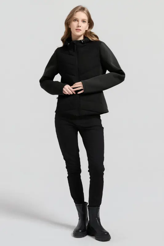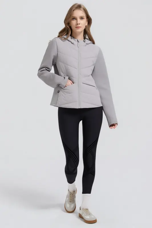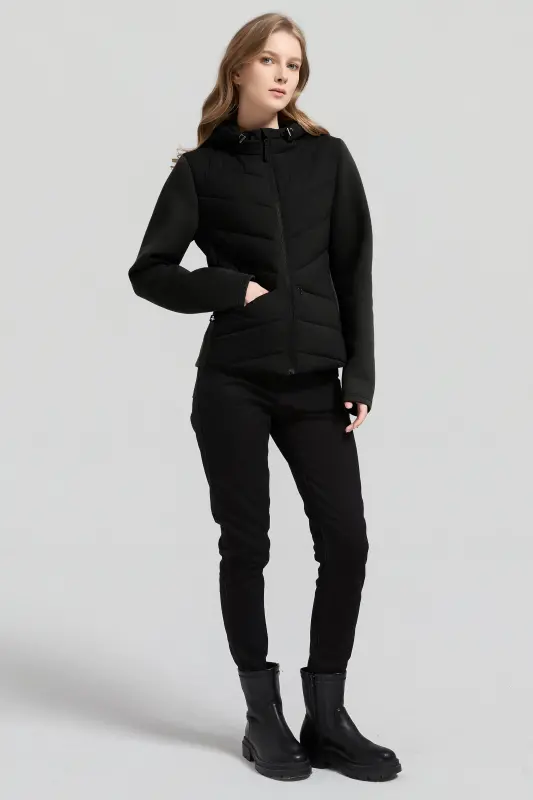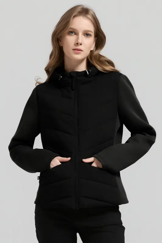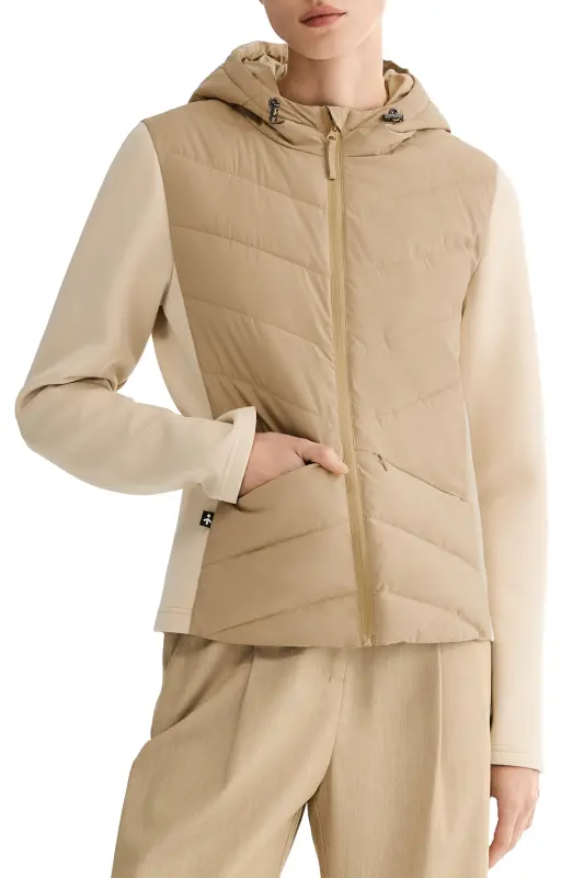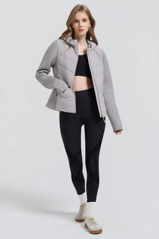 - Elastic Knit Side Panels & Sporty Sleeves:Soft, stretchy knit panels at the side waist contour the body comfortably while working with the structured main fabric to create a three-dimensional waist-defining effect. The sleeves are constructed with a thickened air-layer padding, adding warmth and a dynamic, sporty feel.