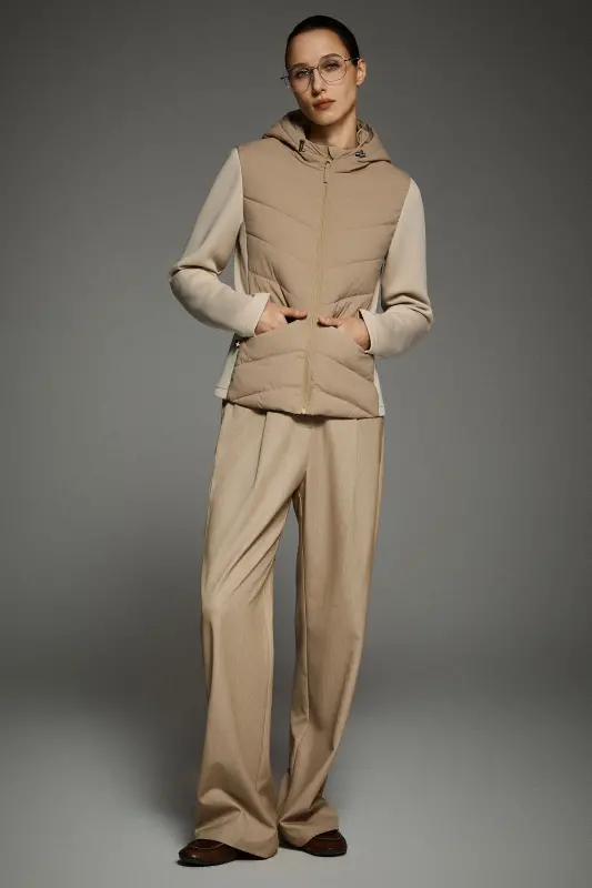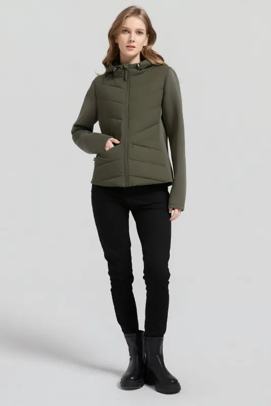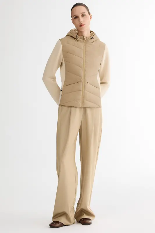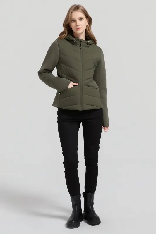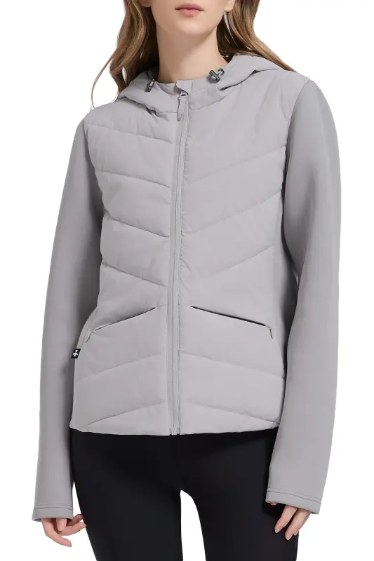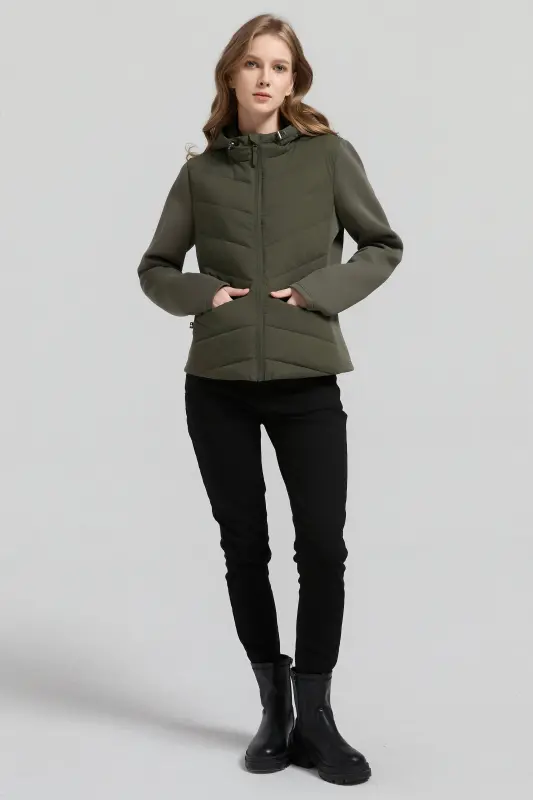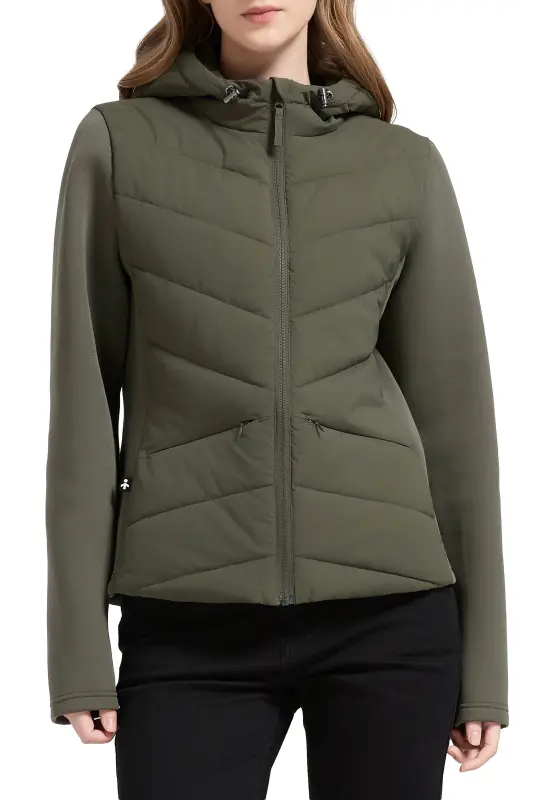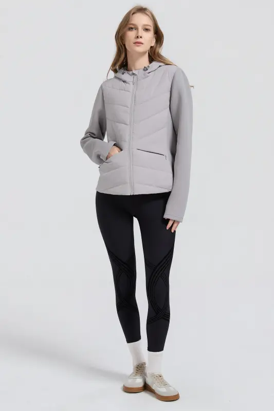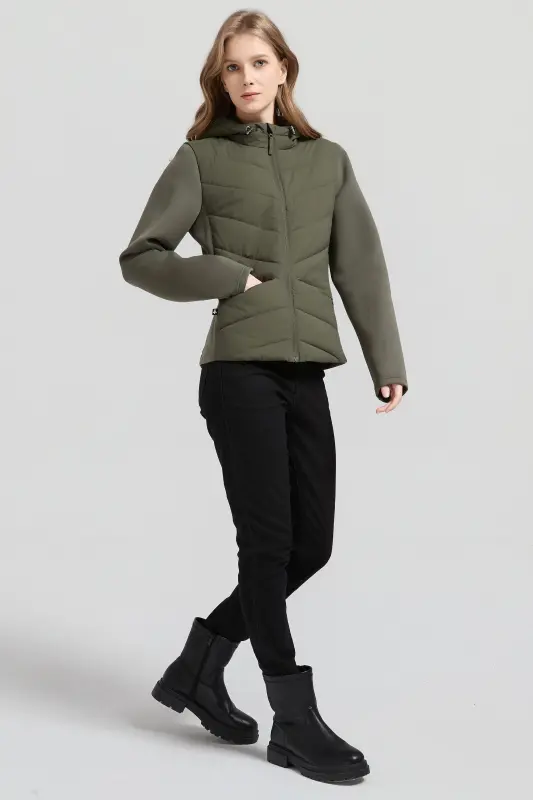 - Elastic Knit Side Panels & Sporty Sleeves:Soft, stretchy knit panels at the side waist contour the body comfortably while working with the structured main fabric to create a three-dimensional waist-defining effect. The sleeves are constructed with a thickened air-layer padding, adding warmth and a dynamic, sporty feel.