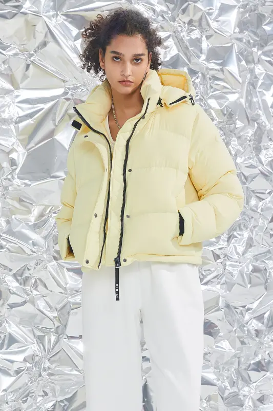 - It features a zipper and snap double closure with a double placket, ensuring maximum protection against the cold. The back hem of the down jacket is gracefully curved, creating a fashionable and flattering look.