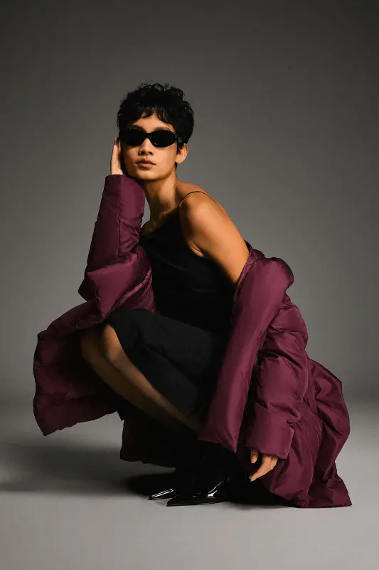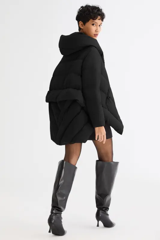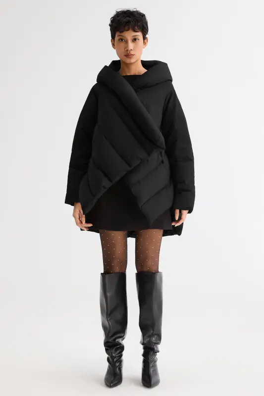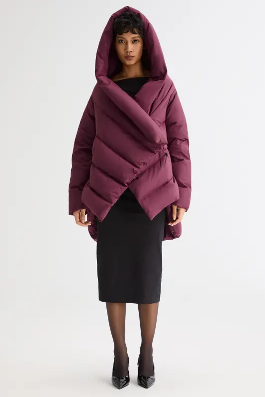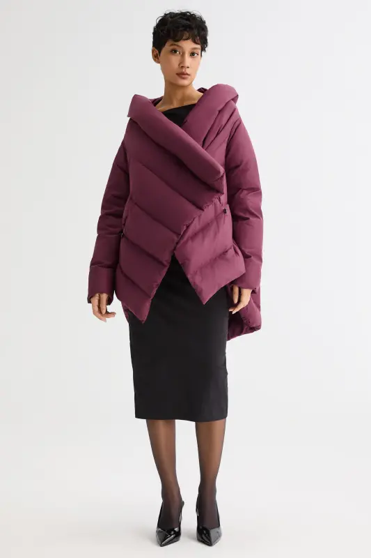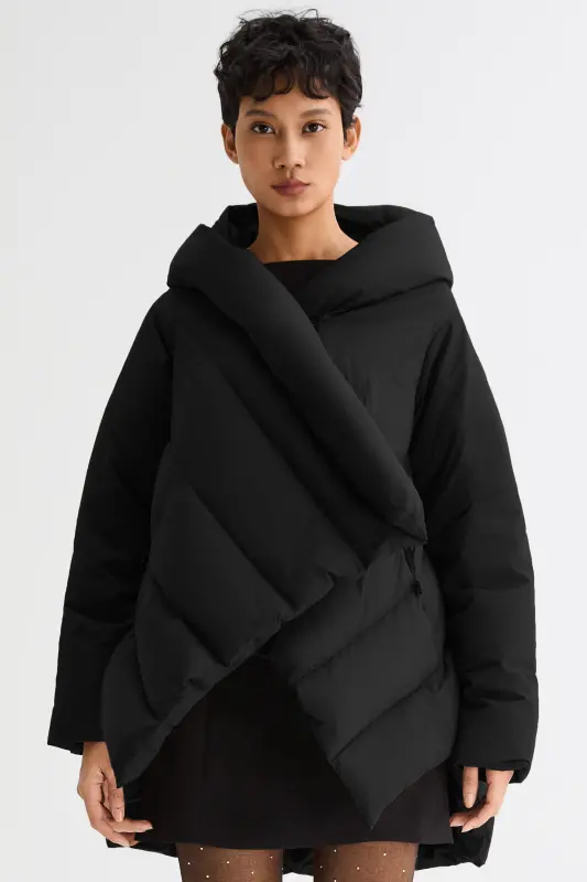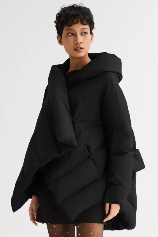 • Unique Cloak-type design featuring oblique placket and hood.