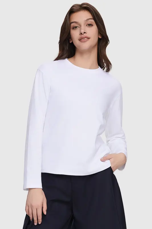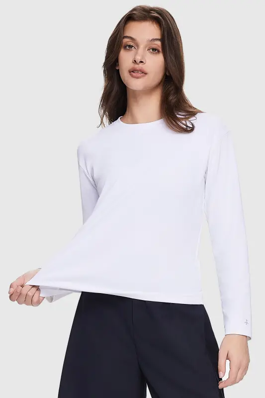 - The moisture-wicking and breathable fabric of this crew neck long-sleeve shirt for women ensures all-day comfort.