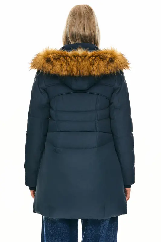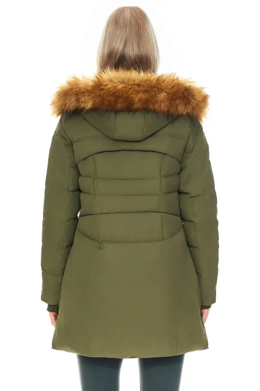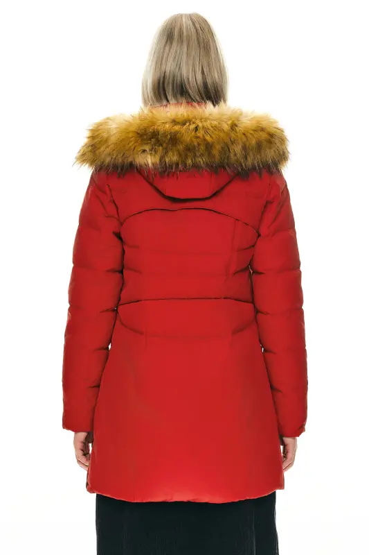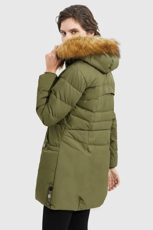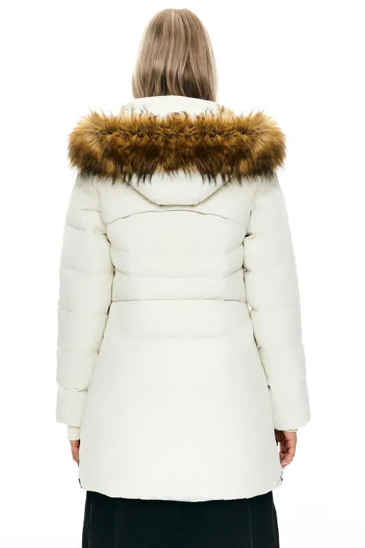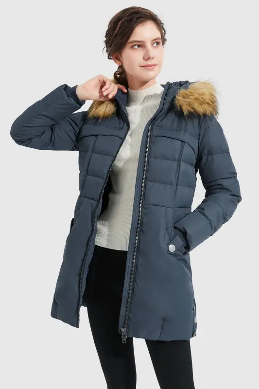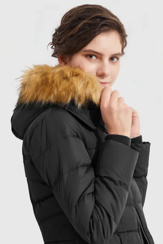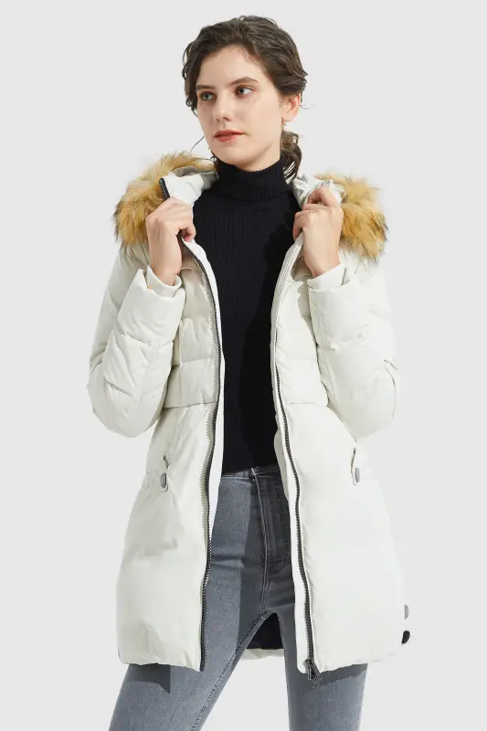 The waist-tightening and slim-fitting design hides your proud flesh at your waist and instead forms a curve there. We used big, good-quality white duck down, which is extraordinary in keeping warm. The big hood with removable high-quality faux fur trim keep you fashion and warm.