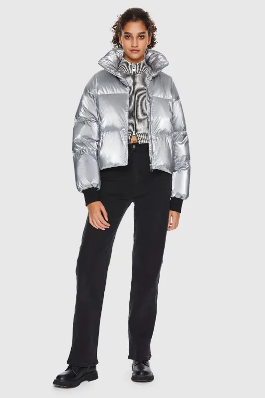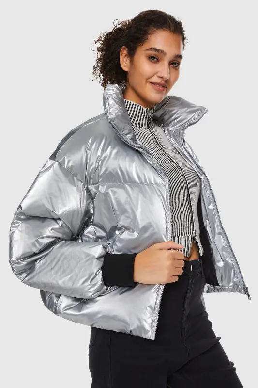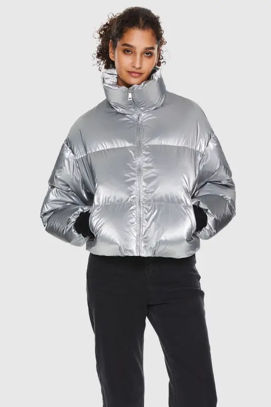 - This Puff-O Cosmos Metallic Shiny Cropped Winter Puffer Jacket is made with 100% Polyamide and 90% white duck down, providing excellent insulation for cold weather. The silver release paper outer material adds softness and smoothness while enhancing the overall appearance. Windproof and waterproof design ensures it meets daily needs, providing protection from the elements.