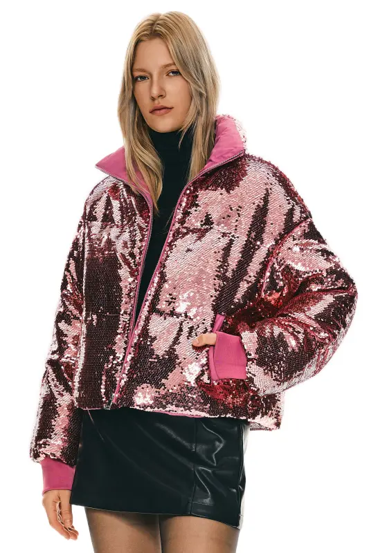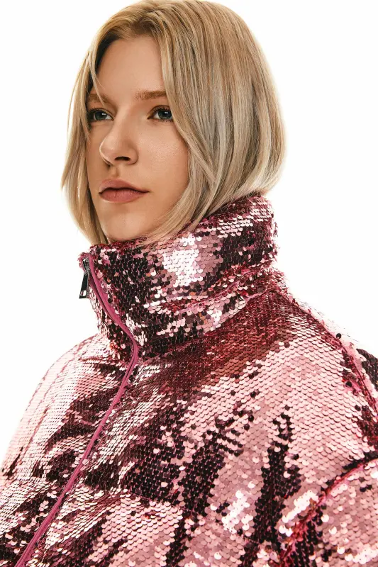 - The stand collar and ribbed cuffs offer a snug fit, preventing cold air from seeping in The adjustable hem enhances comfort while defining the silhouette. They add a modern touch to the glitter jacket’s design, making it both trendy and functional.