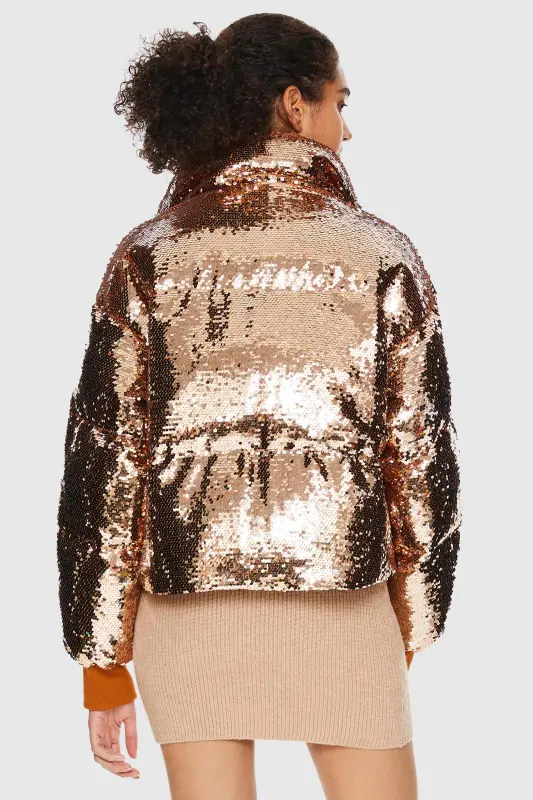 - This Puff-O O-Lab Shiny Sequin Stylish Glitter Jacket fabric is made of 100% polyester and filled with high-quality down insulation, which provides excellent warmth and comfort. Down feathers trap and retain body heat to keep you comfortable on cold days and freezing temperatures.