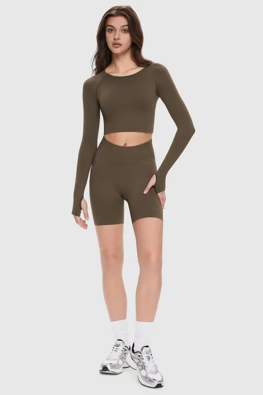 • Seamlessly blends sporty elegance with a thumb hole, round neck, and raglan sleeve for a fashionable and practical yoga top.
