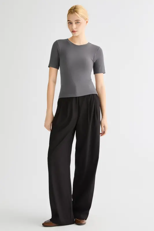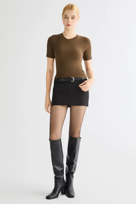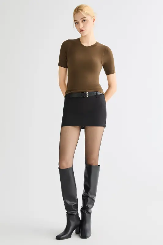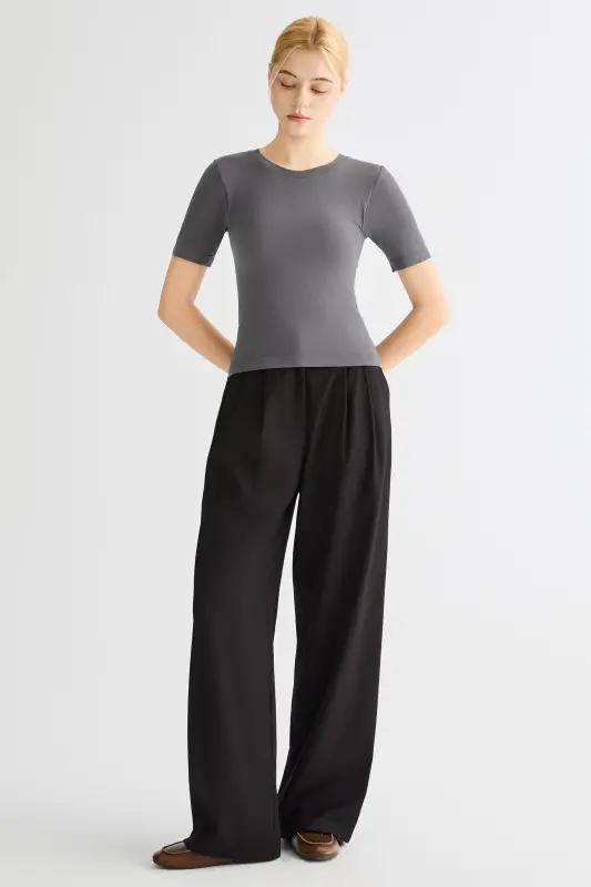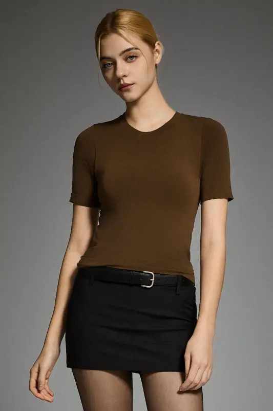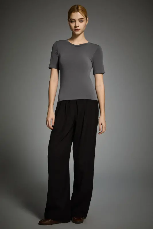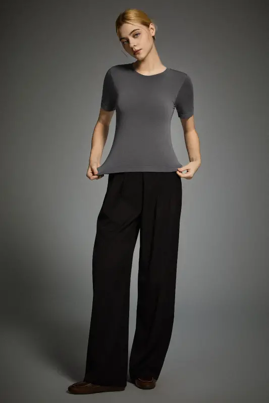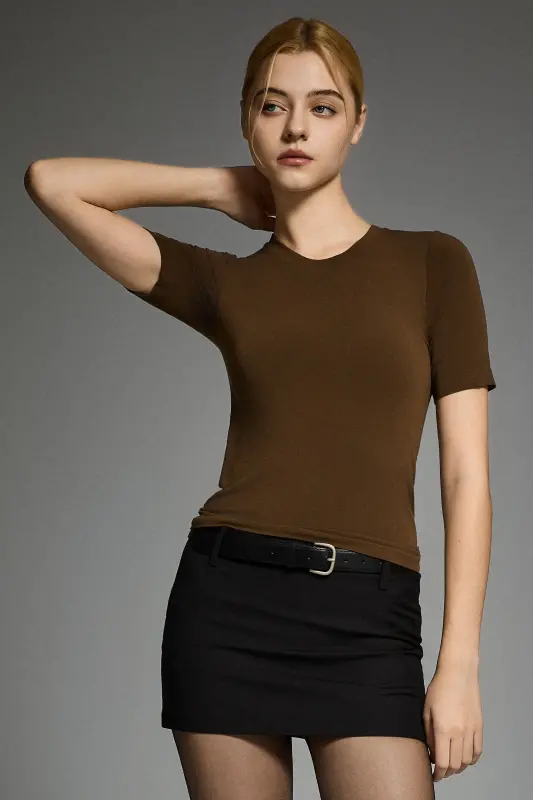 • Refined Round-Neck Silhouette:The classic round neckline and slim, sculpted fit create a polished and flattering shape.  Minimal seams and a streamlined construction elevate the piece with understated sophistication.