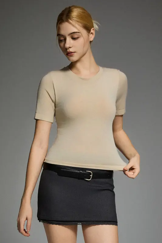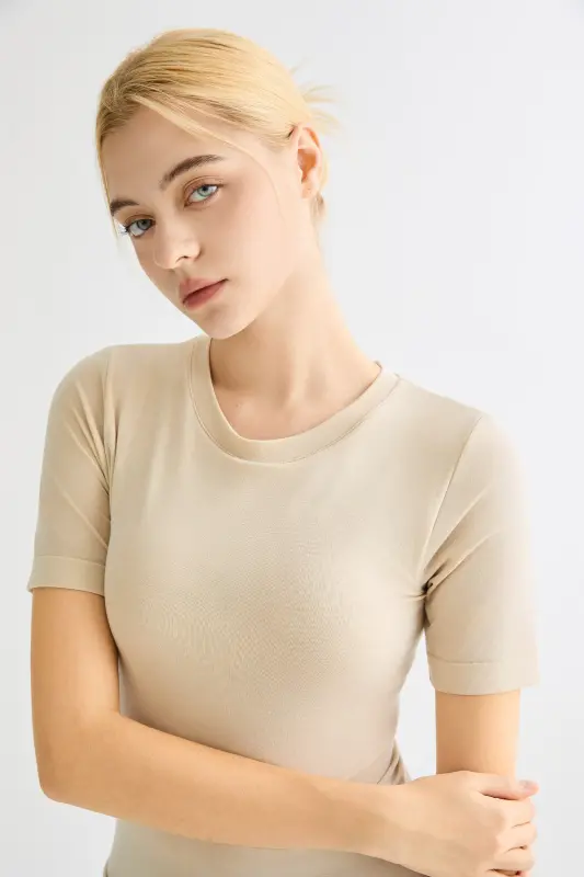 • Premium Elastic Knit Fabric:Crafted from a high-stretch knit made with fine compact yarns, this short-sleeve top offers remarkable softness, durability, and a smooth texture.  Enriched with natural organic silk protein fibers, it helps keep the skin comfortably dry and breathable while maintaining a refined, delicate hand feel.