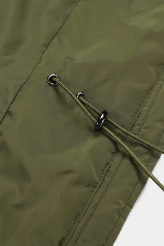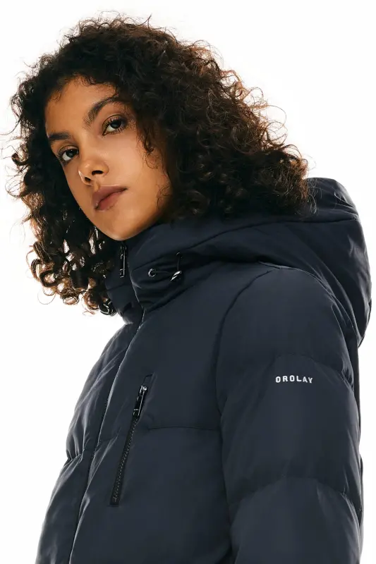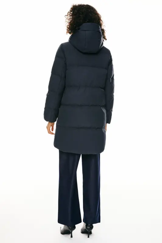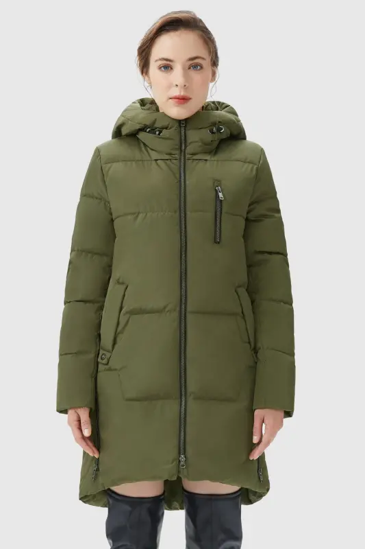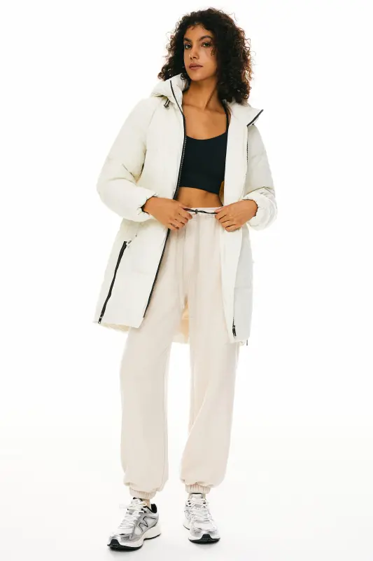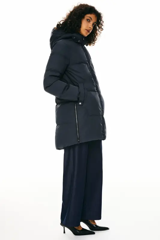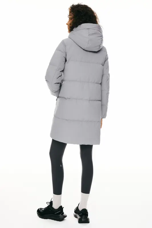 - Our mid-length down jacket, is thoughtfully crafted with a customizable drawstring hood, internal waist drawstring, 2 spacious side pockets, and an additional stylish zipper pocket.