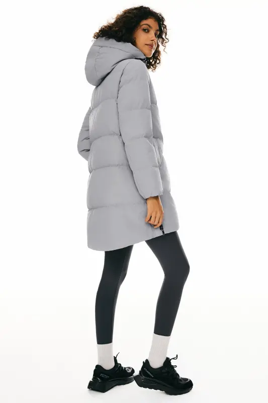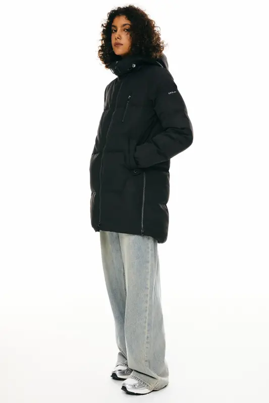 - Embrace winter with our sleek side-entry design adorned with decorative zippers, enhancing your silhouette for a tall and slender appearance. The eiderdown filling accentuates your ‘S-shape’ curve, providing bold style throughout the winter.
